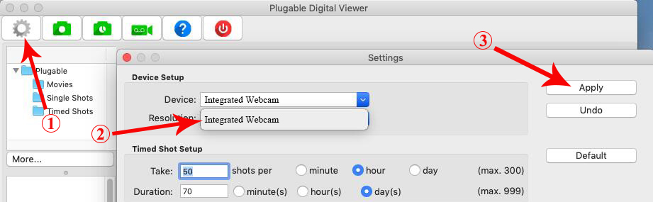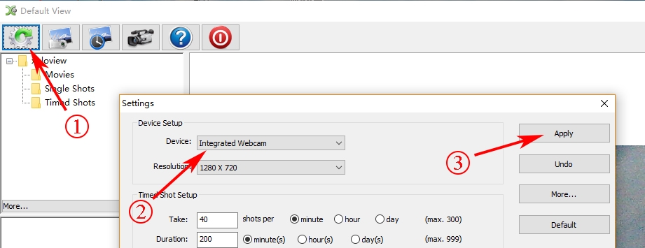Run the "xploview" app and click “Settings” – “Device” to select “Integrated Webcam” on the dropdown list, finally click "Apply".