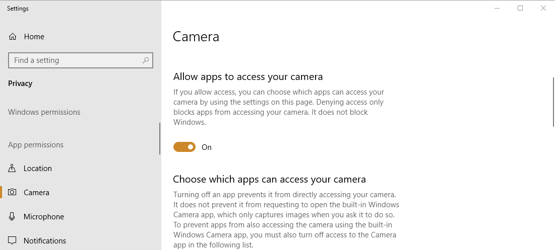 Note: If you can’t get the image on software, please check the privacy setting to let apps access the camera.