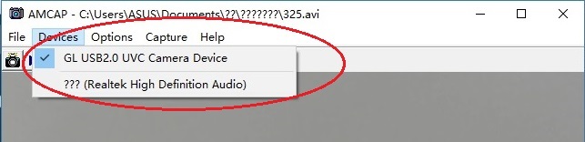 Click "Devices" on the top menu and select the "GL USB2.0 UVC Camera Device" on the dropdown list.
