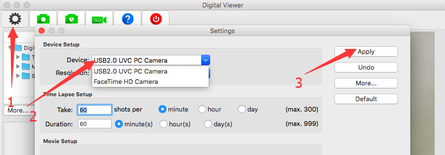 Run the "xploview" app and click “Settings” – “Device” to select “USB2.0 UVC PC Camera” on the dropdown list, finally click "Apply".