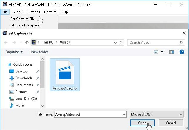 Videos: Click “File” – “Set Capture File” – Find and select an avi format video file – Click “Open”.