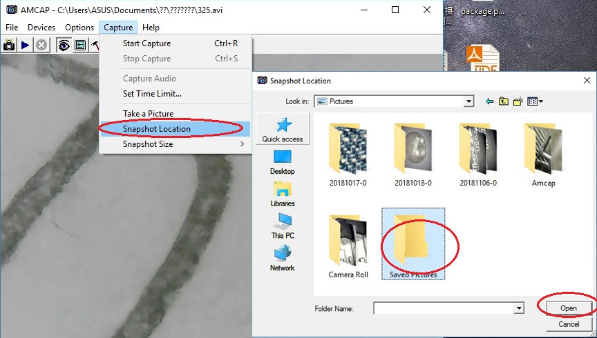 Pictures: Select “Capture” – “Snapshot Location” – Find or new a folder – Click “Open”.