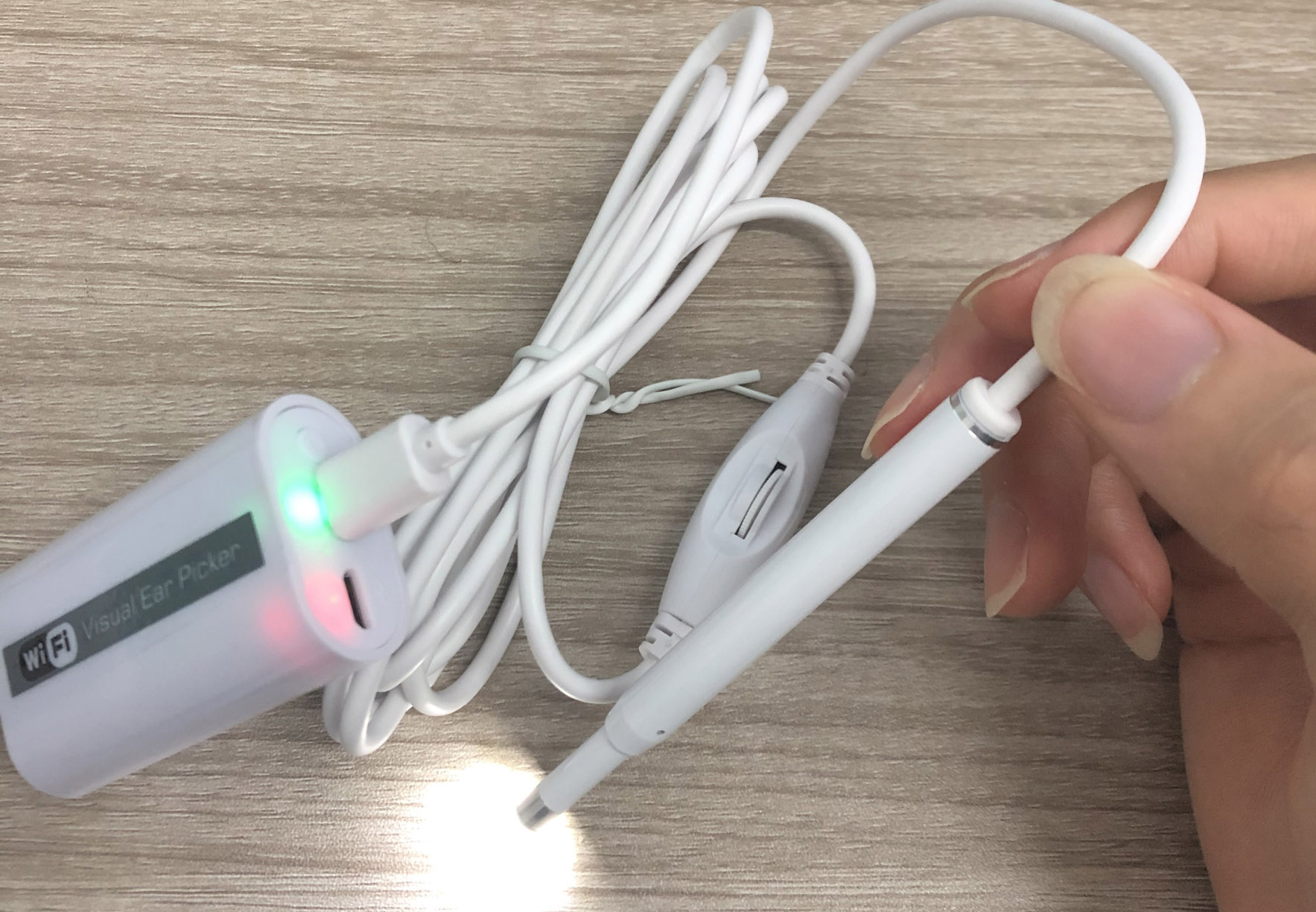 Connect the otoscope to the wifi box(note that selecting the correct port). Long press the power button for 3 seconds to turn on the wifi box.(You can see the green and red indicator light and the LED light on.)