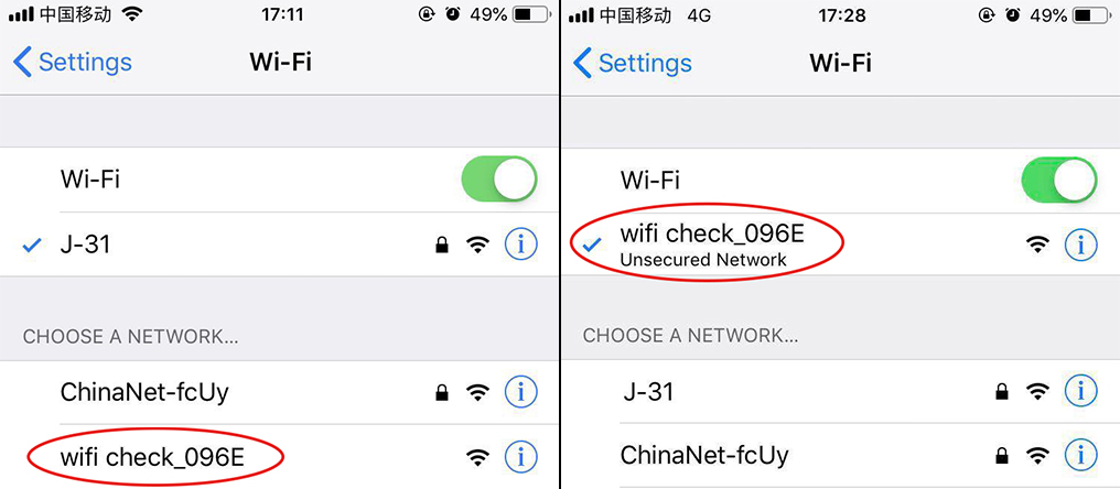 Access to the WiFi settings of your phone, find the wifi named "wifi check_xxxx". Click it to connect.