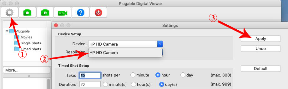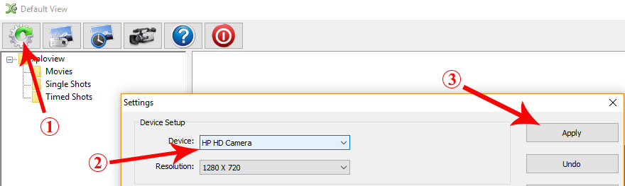 Run the "xploview" app and click “Settings” – “Device” to select “HP HD Camera” on the dropdown list, finally click "Apply".