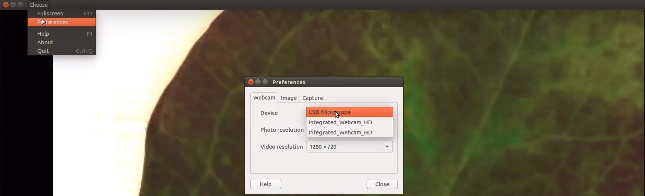 On Ubuntu, search for the application "cheese" and click install. Once the installation is completed, open the application cheese. If the program displays your other camera, click on the word cheese in the top bar to access your preferences. In the webcam tab click on the dropdown menu and select USB Microscope.