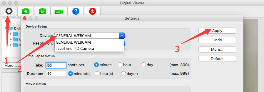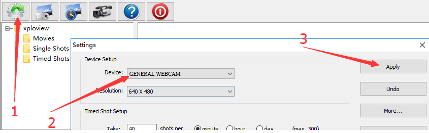 Run the "xploview" app and click “Settings” – “Device” to select “GENERAL WEBCAM” on the dropdown list, finally click "Apply".