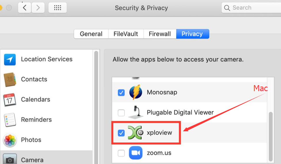Please allow the xploview software to access your camera. Run “Security&Privacy” - Privacy” - “Camera”