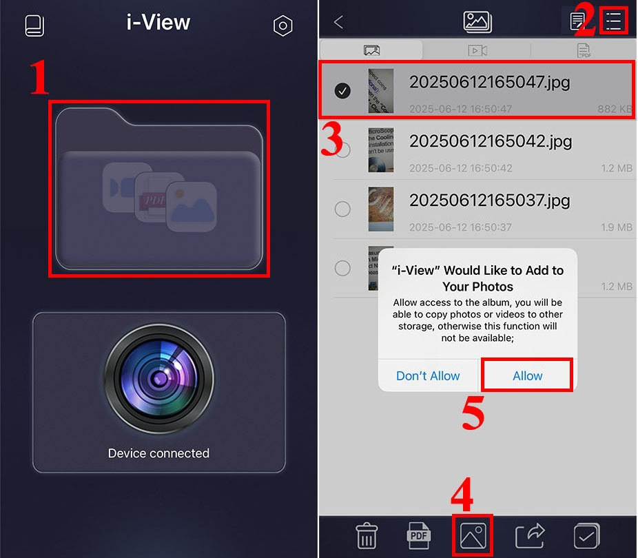 Note: You can add any pictures/videos you taken to your phone’s Photo Album. Tap document icon and tap the icon in the upper right corner, select the pictures you need, tap the download icon to add them to Album. It would ask to access to the album for the first time. Tap " Allow".