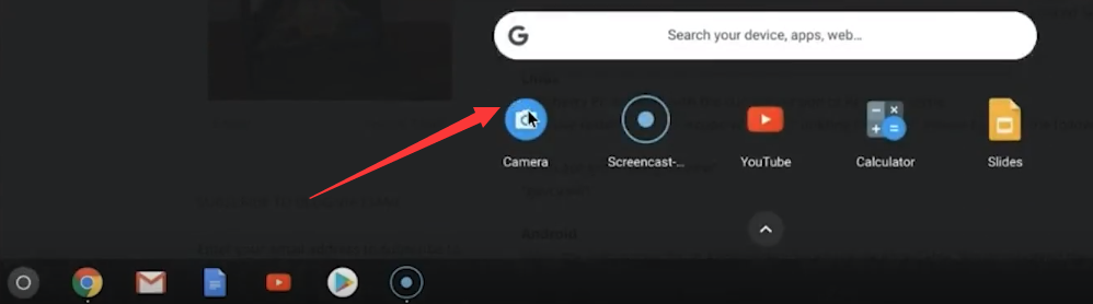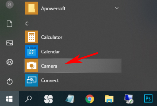 You can click the "Windows" logo on the left to find the "Camera" app in Start menu.