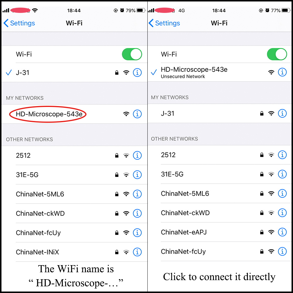 1, Access to the WiFi settings of your phone, find the wifi named "HD-Microscope-xxxx". (No password.)